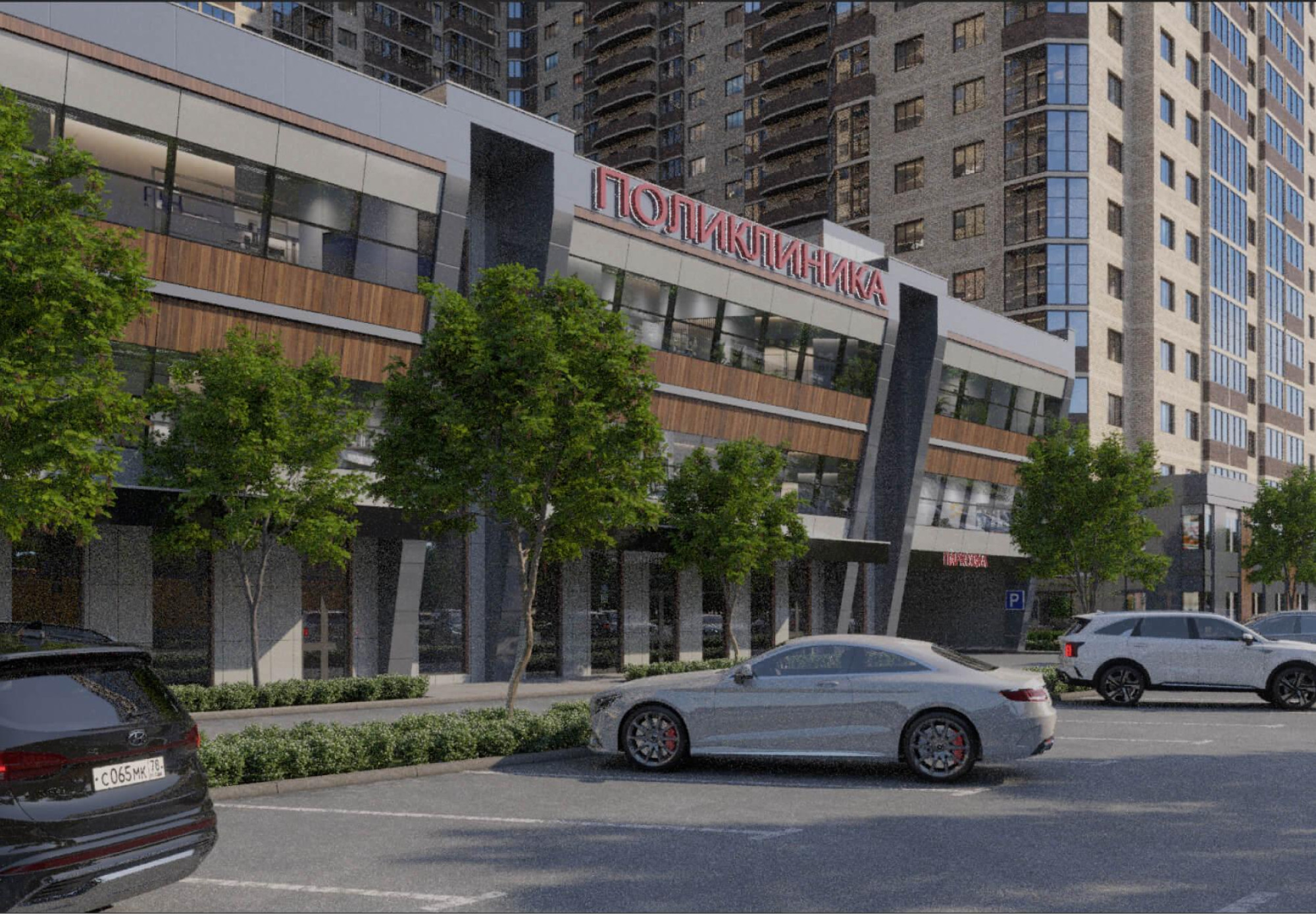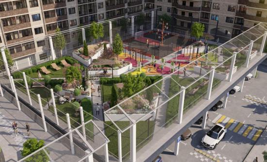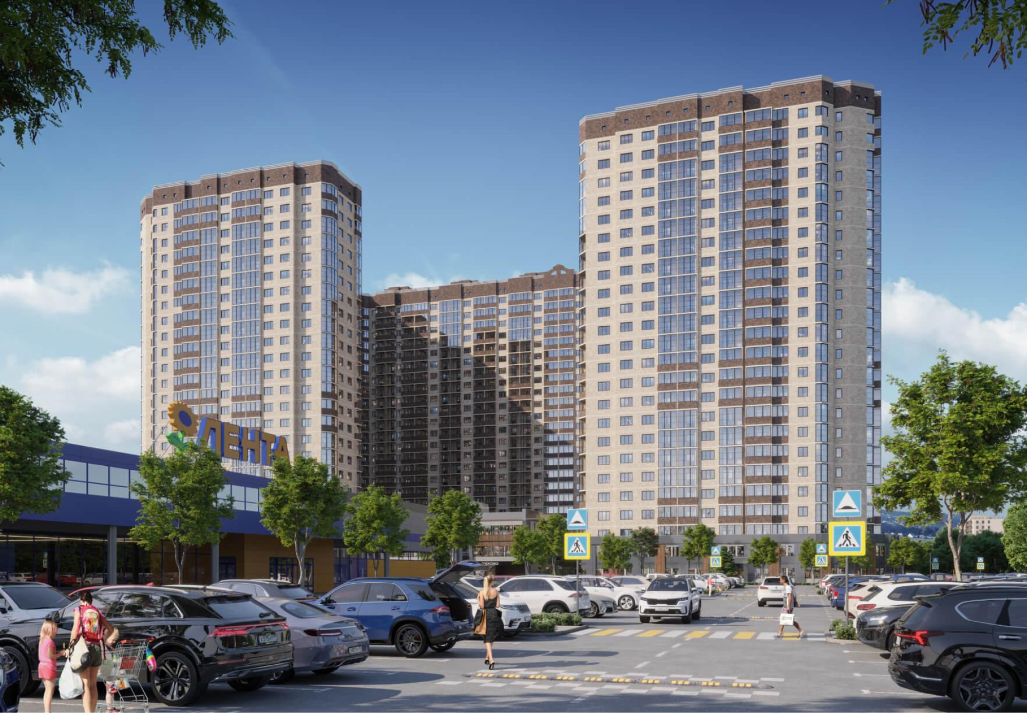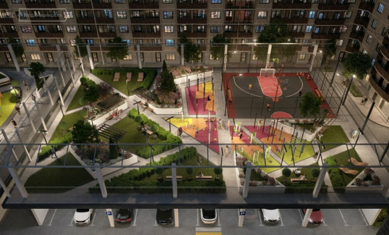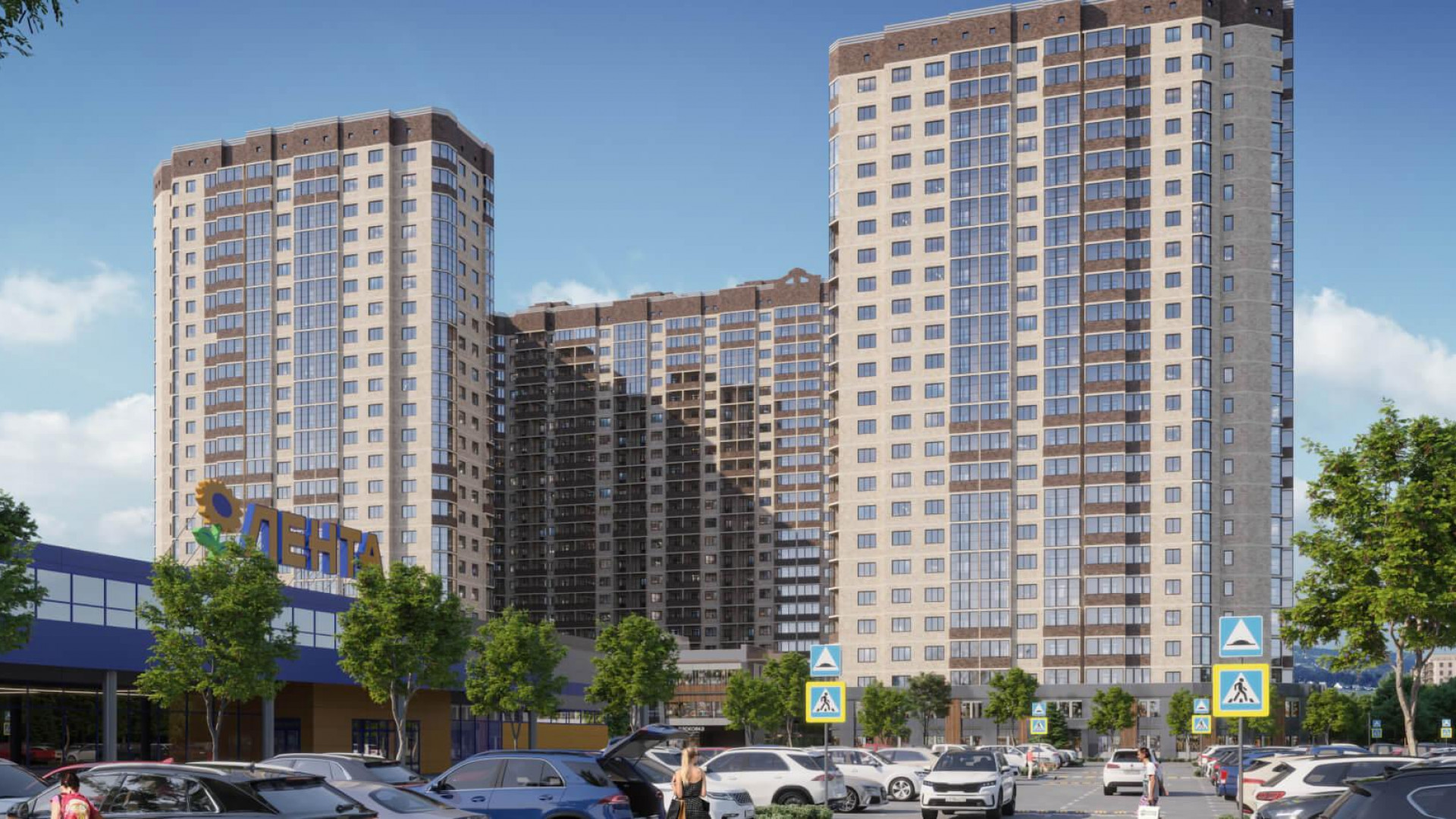 транспортная развязка, магазины, места отдыха и развлечений, парковые зоны.