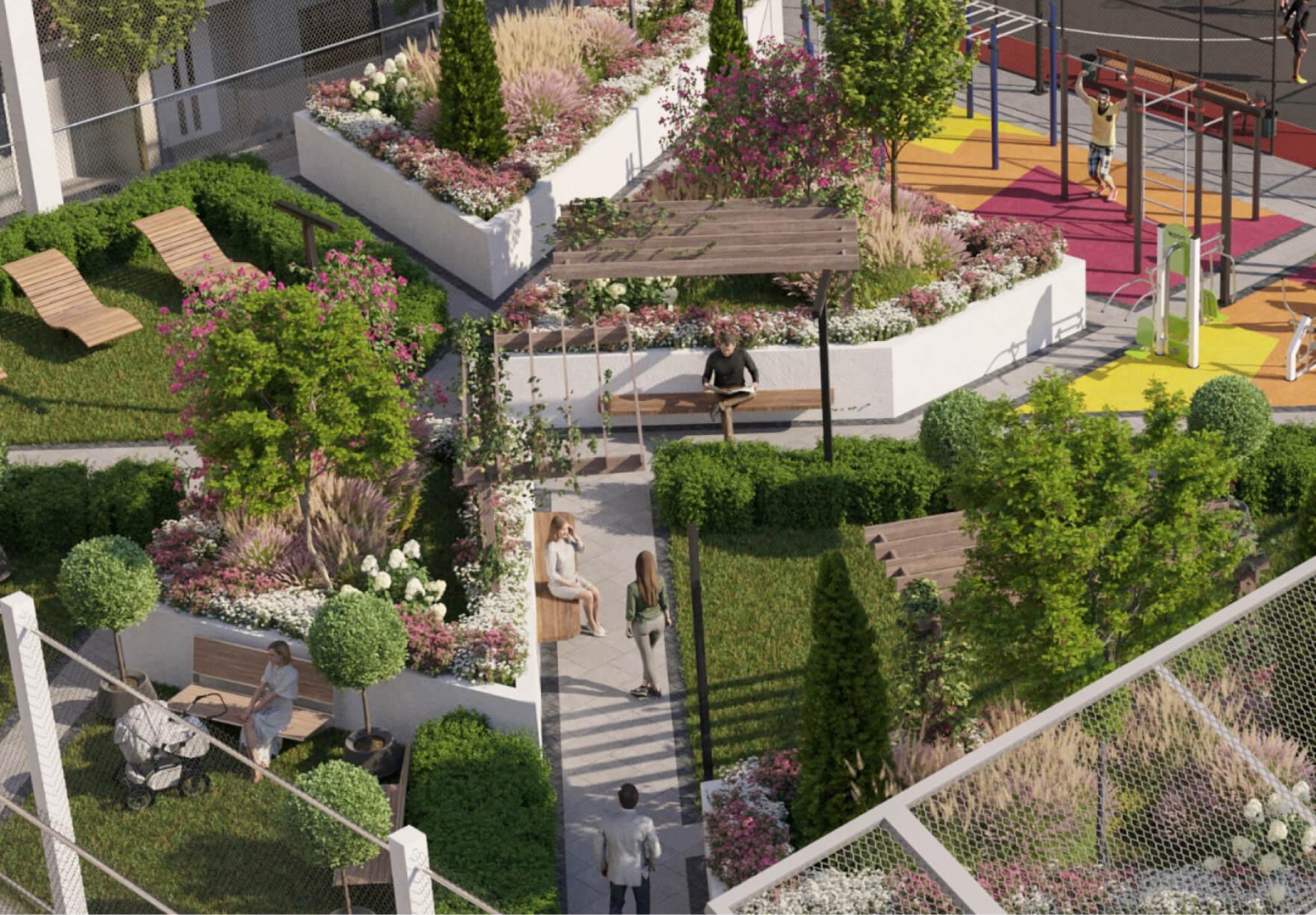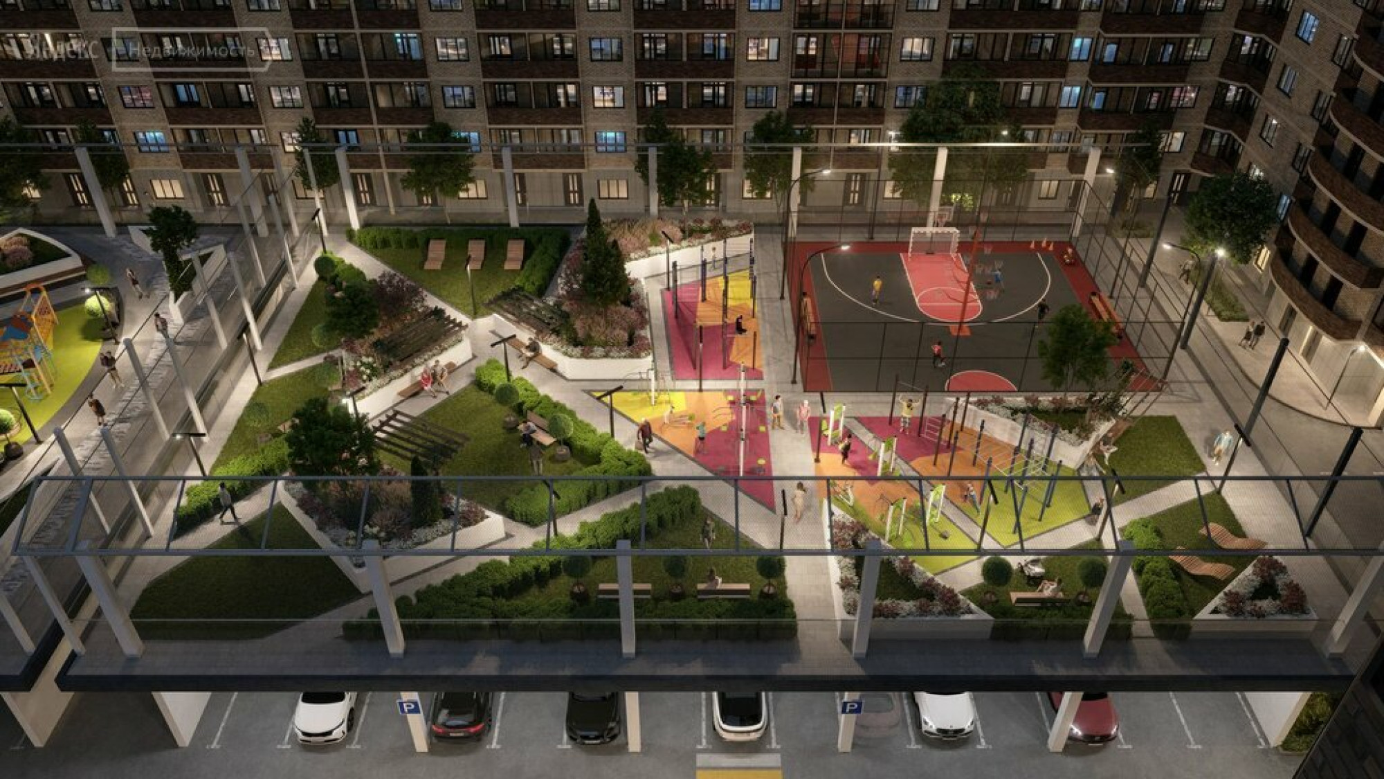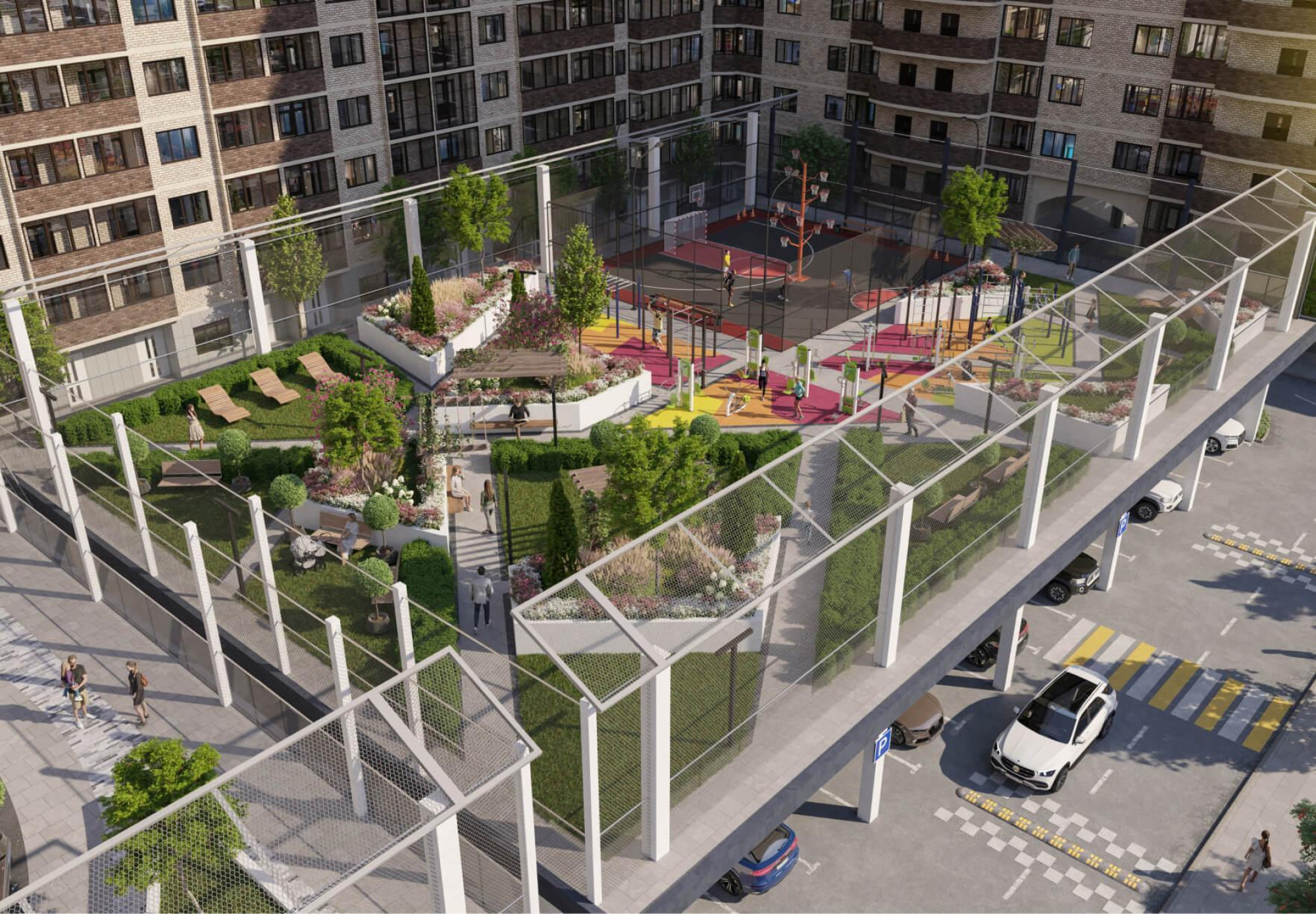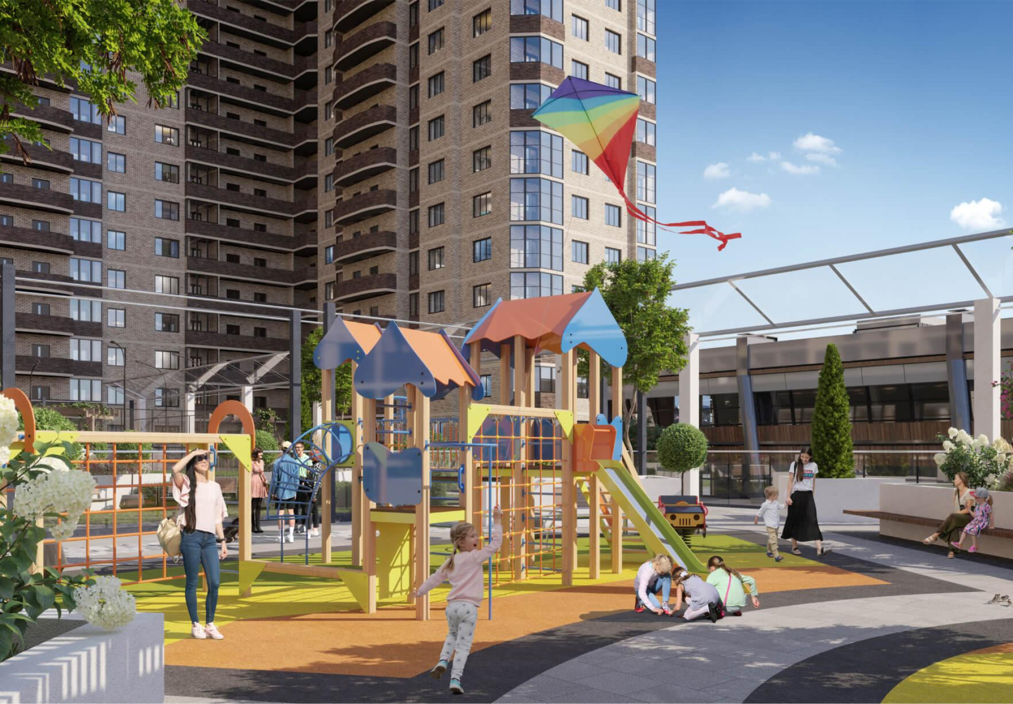 транспортная развязка, магазины, места отдыха и развлечений, парковые зоны.